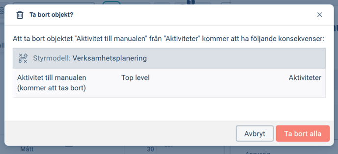 Du får sedan en sammanfattning över konsekvenser av borttagningen. För att radera objektet behöver du trycka på Ta bort alla, se bild nedan.