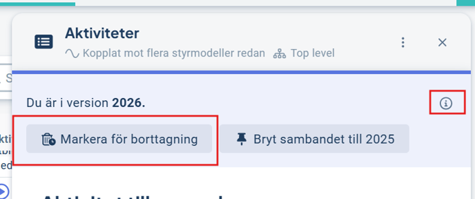 Om du arbetar i planeringsversionen får du först valet att markera aktiviteten för borttagning. Aktiviteter som är markerade för borttagning kommer automatiskt att tas bort i samband med versionshantering. Önskar du att radera en aktivitet direkt och inte vänta på versionshanteringen kan du efter att du har markerat objektet för borttagning öppna den på nytt och radera via trepunktsmenyn enligt ovan. Objektet kommer då att försvinna ur planeringen, men fortsätta att finnas kvar i den aktuella versionen.