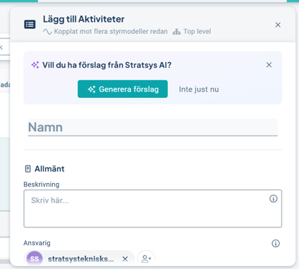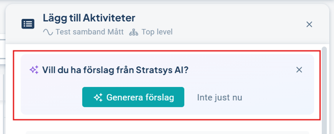 Om ni har AI-licens och aktiverat möjligheten att få hjälp av AI att generera förslag på aktiviteter kommer detta dyka upp överst i objektfönstret.