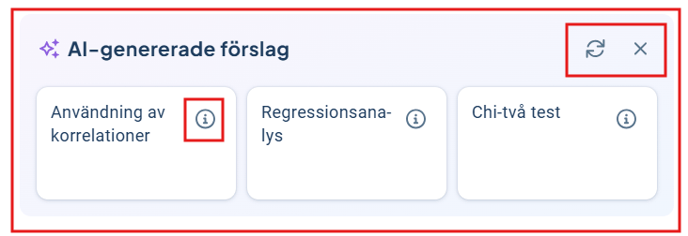 Tryck på info-knappen för att få en beskrivning av förslaget. Har ni ett beskrivningsfält knutet till era aktiviteter kan ni förslagsvis lägga den beskrivning där. Är du inte nöjd med de givna förslagen kan du trycka på Uppdatera för att generera nya förslag. Tryck på X för att dölja AI-förslagen.