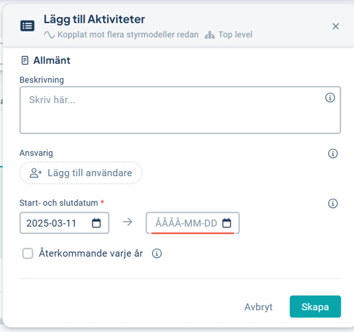 Varje aktivitet ska också ha ett start och ett slutdatum. Datumen ska definiera den tid som aktiviteten ska pågå. Dagens datum blir automatiskt startdatum i aktuell version. I planeringsversionen blir startdatum istället första januari i planeringsåret om inte kalenderåret redan har slagit över, då blir det istället dagens datum precis som för aktuell version.
