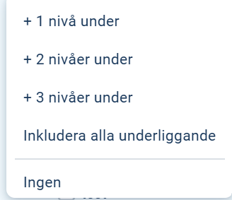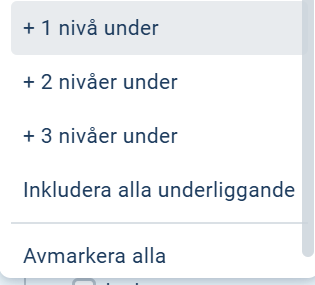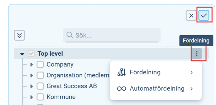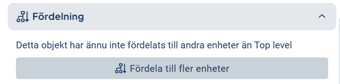 Fördelning - här kan du snabbt välja fördelning baserat på förinställda val så som ex +1 nivå under. Du kan också avmarkera alla markerade nivåer för att ta bort objektet från dem. Tänk på att om underliggande enheter har skapat andra objekt kopplat mot aktiviteten så kommer dessa att försvinna om du tar bort fördelningen.