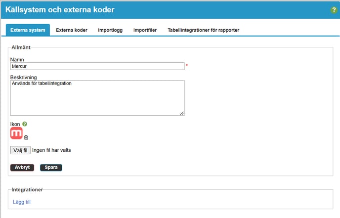 Skapa ett källsystem under fliken Externa system genom att klicka på Lägg till. Skriv valfritt namn, förslagsvis Mercur och lägg till en beskrivning och ikon om så önskas. Klicka därefter på Spara.