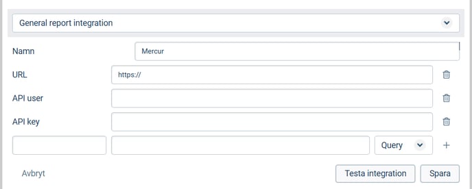 Välj General report integration i drop-down listan och fyll i följande parametrar som ni får av er Mercurkonsult: