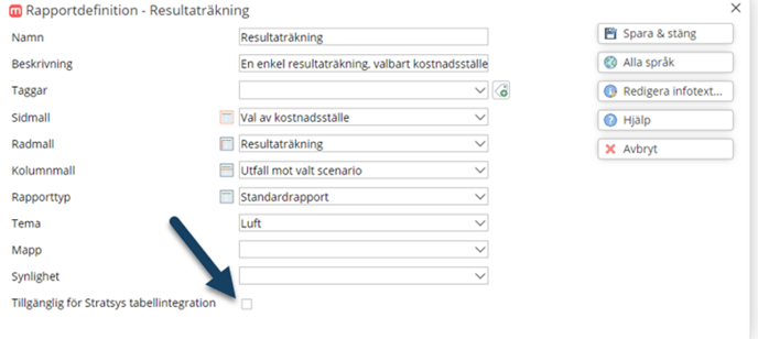 - Gå till rapportdefinition för rapporten och kryssa i kryssrutan ”Tillgänglig för Stratsys tabellintegration” för att göra rapporten möjlig att hämtas in som tabell i Stratsys.