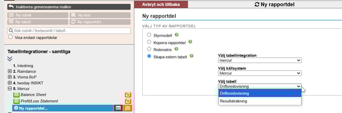 Börja med att skapa en rubrik som du vill knyta tabellen till. Alternativ markera en befintlig rubrik. Klicka på Ny rapportdel: