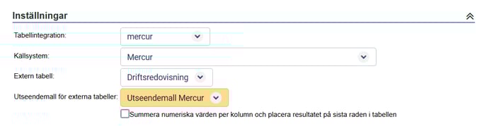 Tabellintegrationen mot Mercur har stöd för att formatera radtyperna Rubrik, Delsumma, Summa och Övrigt (ej grupperingsrubrik).