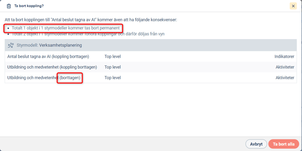 Välj "Ta bort alla" om du vill ta bort kopplingen. Om det finns objekt som försvinner permanent som du vill spara, tryck istället "Avbryt" och säkerställ att dessa objekt först får en ny koppling.