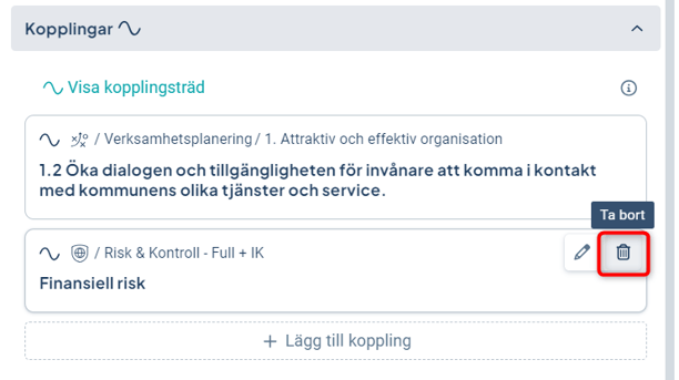 Om det inte visas någon papperskorgssymbol, kan det exempelvis bero på att du saknar behörighet att ändra objektet, eller att du försöker ändra på ett underliggande objekt där kopplingen styrs från översta nivån.