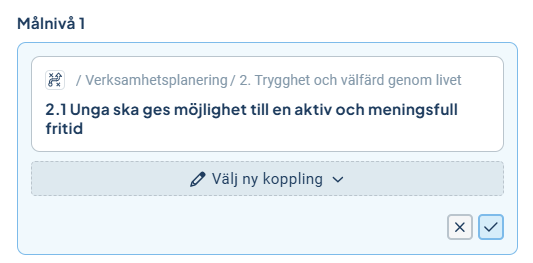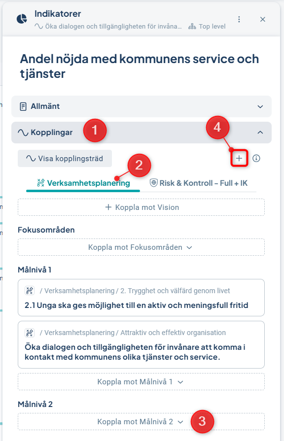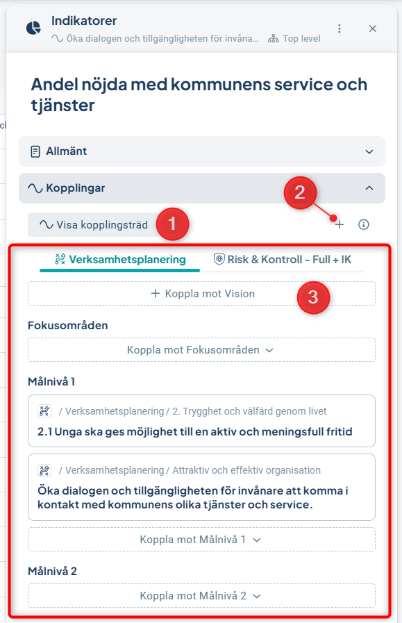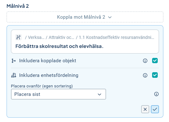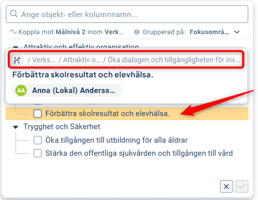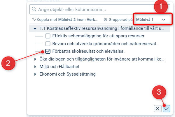 Klicka på "Koppla mot ..." för den kolumn som du vill koppla mot, exempelvis "Koppla mot Målnivå 2" som i bildexemplet (3).