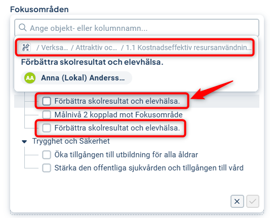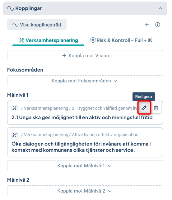 Medan det undre objektet är kopplat till samma fokusområde, men istället via ett mål som heter "Öka dialogen och tillgängligheten...".