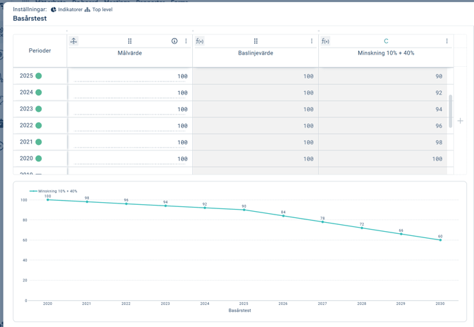 - Formeln beräknar värdet för 2030 som: Målvärde år 2030 = 100 − (100×0,40) = 60