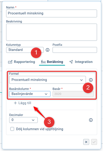 2) Välj formel "Procentuell minskning". Välj din måttdatakolumn som innehåller ditt basår som "Basårskolumn". Basåret visas då till höger. Det är detta år som blir startåret för minskningen. Om du behöver ändra år, gör du det i basårskolumnen, vilket då uppdaterar basåret även här.