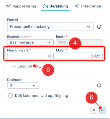 4) Fyll i minskning i procent, mellan 0 och 100, och målår. Om du anger 10% och ett målår, så innebär det att värdet minskar i jämn takt (rät linje) med totalt 10% fram till målåret. Bestäm alltså vilken minskning du önskar nå ett visst år, och ange detta.