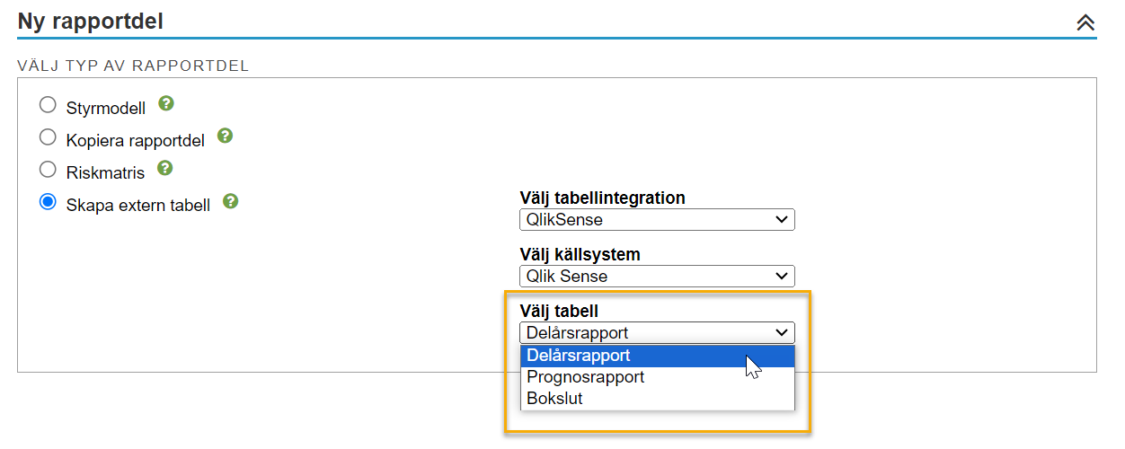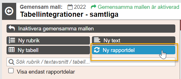 Börja med att skapa en rubrik som du vill knyta tabellen till. Alternativ markera en befintlig rubrik. Klicka på Ny rapportdel: