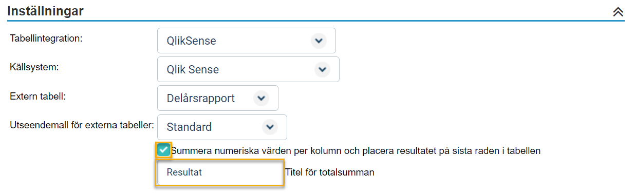 Här kan du redigera din externa tabell genom att byta tabell, ta bort tabell, byta utseendemall, justera kolumnbredd samt lägga till summarad om så önskas.