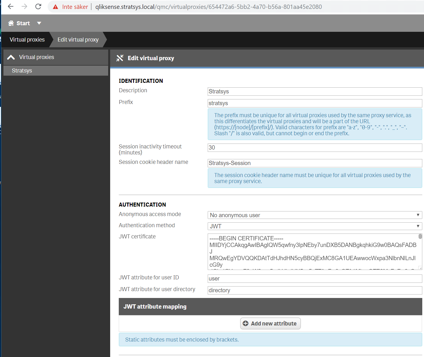 Skapa en egen virtuell proxy i QMC för att tillåta åtkomst för användaren. Döp den gärna till Stratsys eller motsvarande. Autentisering ska ske via JWT-certifikat. Den publika nyckeln till certifikatet bifogas sist i detta dokument. I fältet för User ska propertyn som pekar ut användarens identitet pekas ut.