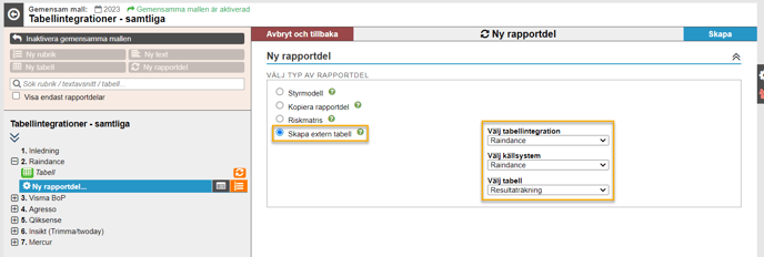 Börja med att skapa en rubrik som du vill knyta tabellen till. Alternativ markera en befintlig rubrik. Klicka på ”Ny rapportdel”: