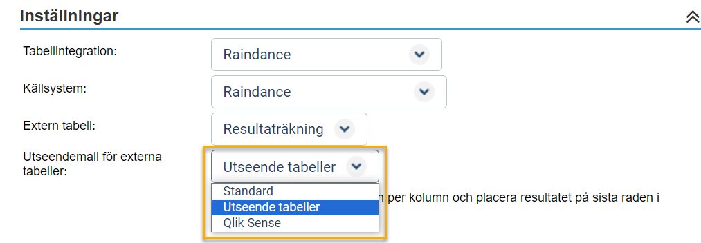 För att använda den nyskapade utseendemallen markerar du den tabell du önskar ändra och väljer aktuell utseendemall i drop-down-listan, glöm inte att spara. Det går bra att använda olika utseendemallar för olika tabeller i en och samma rapport.
