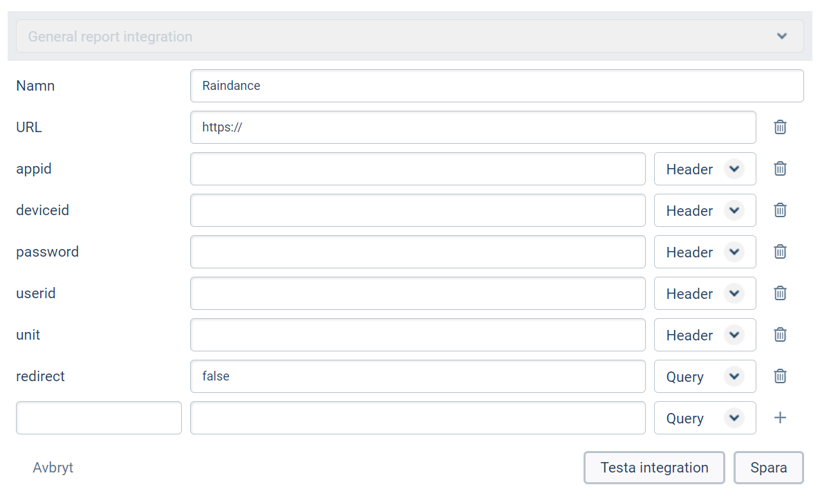 Välj General report integration i drop-down listan och lägg till och fyll i följande parametrar: url, appid, deviceid, password, userid, unit, redirect. Samtliga parametrar ska vara Header-parametrar förutom redirect som ska vara en Query-parameter. Informationen att fylla i får du från din ansvarige Raindancekonsult i samband med uppstart.