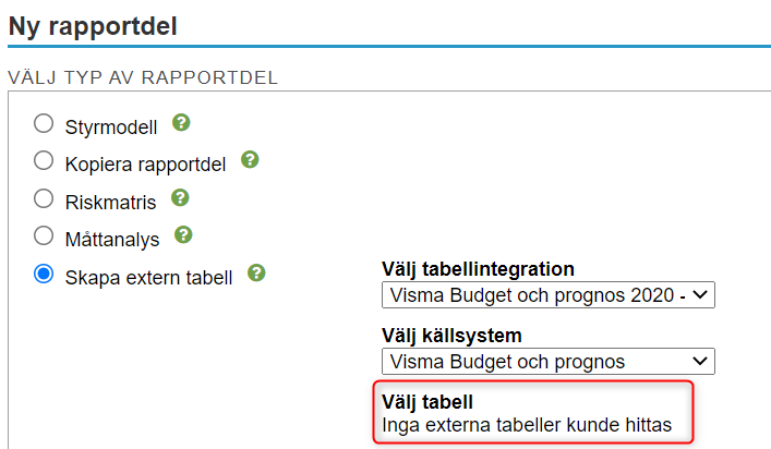 Välj den tabellintegration och källsystem du vill hämta din tabell ifrån. Det är möjligt att integrera tabeller ifrån olika källsystem i en och samma Stratsysrapport. I drop-down-listan "Välj tabell" ser du alla de tabeller som finns tillgängliga (publicerade) i valt källsystemet. Välj den tabell du vill lyfta in till Stratsys på den rubrik du står på och klicka därefter på Skapa.