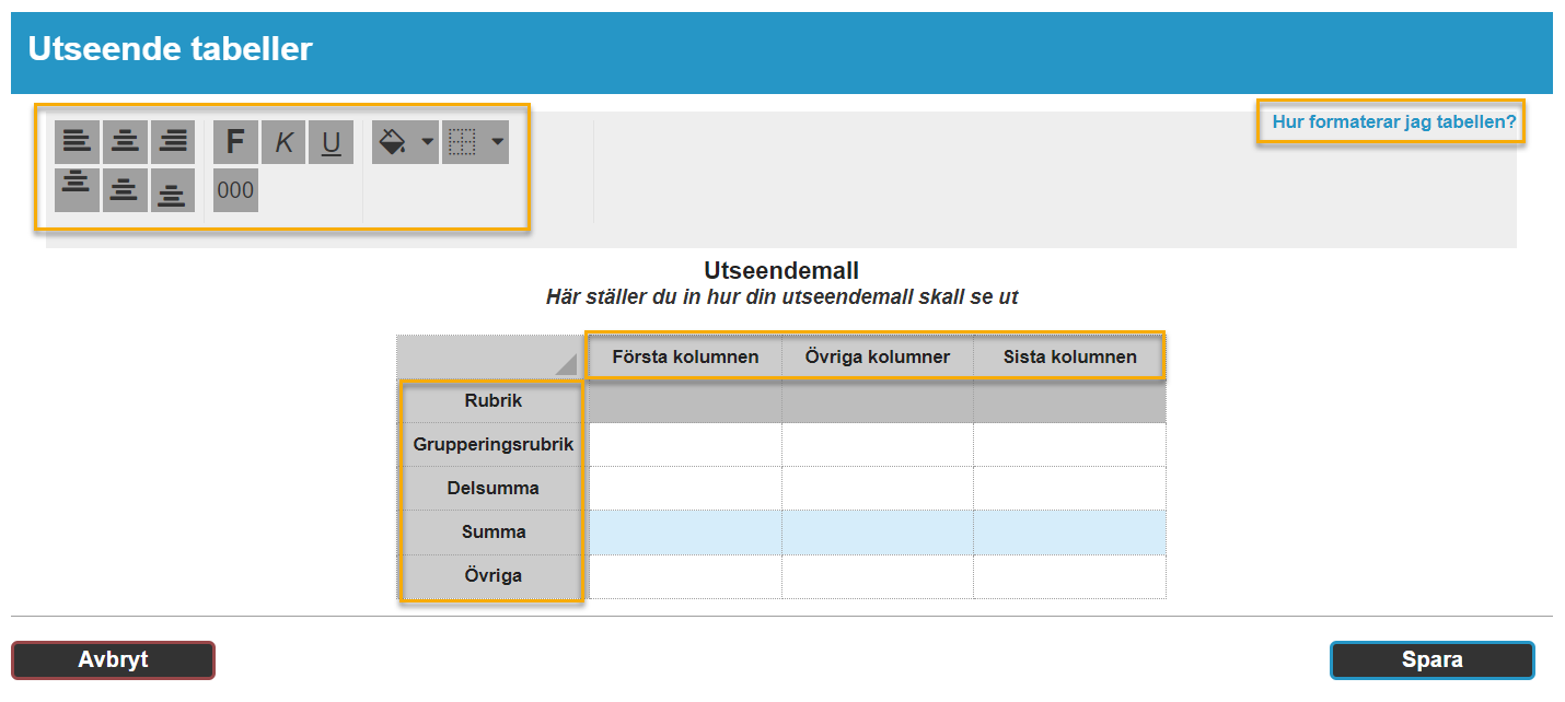 Klicka på ”Ändra tabellmall” och gör de formateringar som önskas. Markera enskilda celler eller hela rader/kolumner i tabellen nedan och gör dina utseendeinställningar med hjälp av knapparna i verktygsfältet. Klicka därefter på spara. Behöver du guidning kan du klicka på "Hur formaterar jag texten".