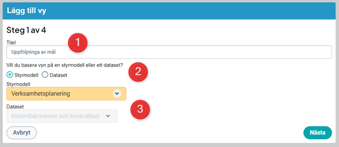 Steg 1: Ge vyn ett beskrivande namn (1), välj om du vill basera vyn på en styrmodell eller ett dataset (pågående utveckling) (2) och vilken styrmodell eller dataset som vyn skall baseras på (3):