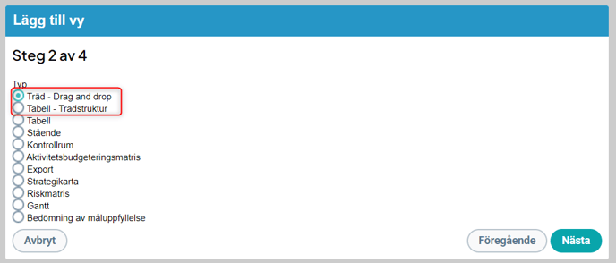 Steg 2: Välj vytyp (även kallat visningsläge). De vanligaste är Träd och Tabell med trädstruktur. Du kan ändra vytyp/visningsläge senare.