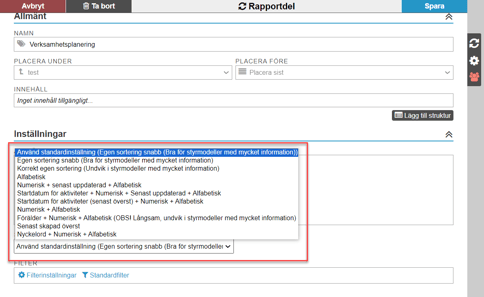 I rapportdelar visas sorteringsmetoderna som en drop-down i de allmänna inställningarna för rapportdelen under rubriken "Sorteringsinställningar".