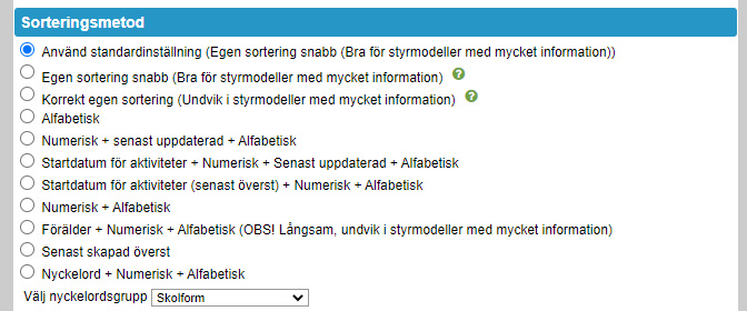 Notera: Önskar ni ha en annan standardsortering än den som är vald (syns i parantes vilken det är efter "Använd standardsortering"), så går det att ställa om för er databas. Kontakta Stratsys för hjälp med att ändra! Detta är en databasöverskrivande inställning som ändrar standardvalet överallt i er databas.