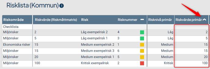 Kolumnerna sorteras alfabetiskt vid textinnehåll och numeriskt för t.ex. måttdata. Det går även att sortera på färg och risknivå i korrekt ordning.