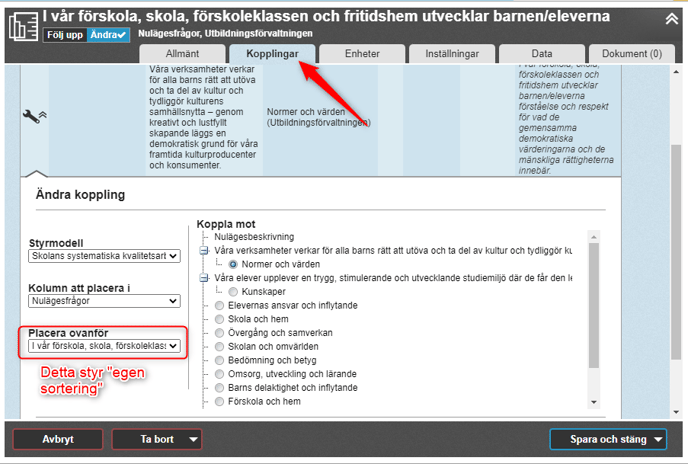 Både "Egen sortering snabb" och "Korrekt egen sortering" utgår från den sortering som är gjord manuellt i "Placera ovanför" (eller via drag-n-drop i räda tråden vyn) och som visas från kopplingsfliken i nodens ändraläge. Har du inte styrt ordningen via kopplingsfliken så hamnar noderna i den ordning som de läggs till.