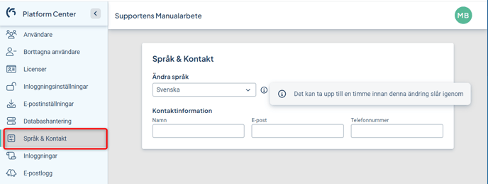 Språkinställningar för hela plattformen hittar du i Plattformsadministrationen i menyn Språk & Kontakt. Här kan du som har rollen är superadministratör i plattformen byta språk för hela plattformen.
