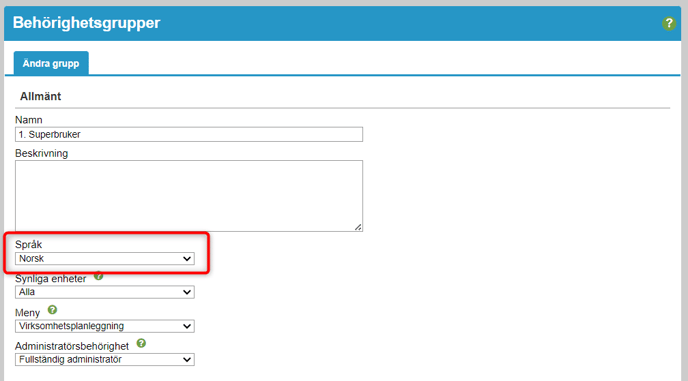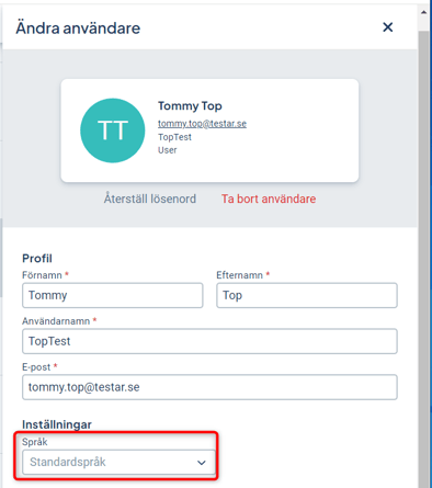 Notera: Användaren behöver logga ut och logga in igen för att språkändringen skall slå igenom. Detta gäller också då användaren själv byter språk.