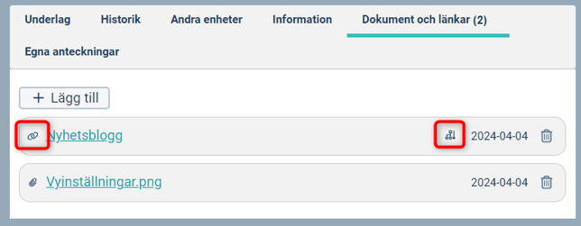 Under fliken Bilagor kan du se länkar eller dokument som finns kopplade. Dessa är klickbara och öppnas då i en ny flik eller laddas ner i din webbläsare.