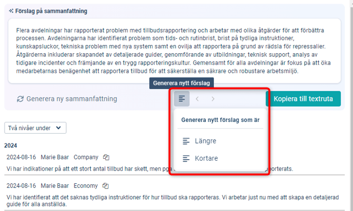 Om du inte är nöjd med förslaget, kan du generera om. Du kan också välja att generera förslaget med en längre eller kortare text. Du väljer naturligtvis alltid själv vilka delar du vill ta med i din egen kommentar - texten är bara ett förslag.