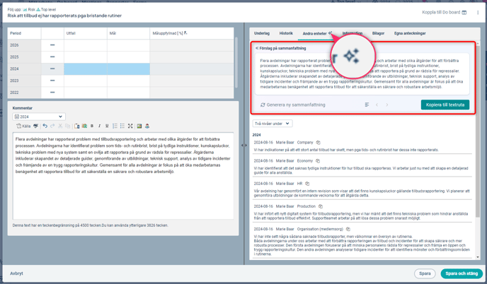 Om ni som kund använder Stratsys AI och den är aktiverad för denna produkt, kan du skapa en automatgenererad sammanfattning från samtliga underliggande enheter. Denna sammanfattning kan du kopiera in och sedan arbeta vidare med. Om du ser vår AI-symbol "stjärnor" till höger om fliknamnet, så har du tillgång till funktionen.