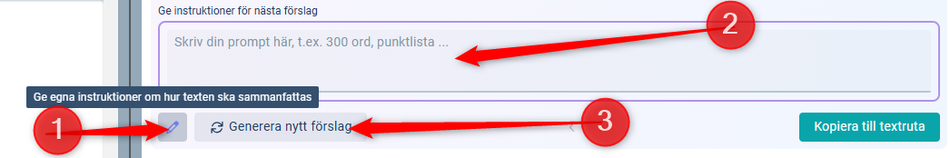 Du kan välja att ge instruktioner för hur sammanfattningen av de underliggande enheternas textavsnitt ska göras genom att trycka på pennan (1) och skriva dina instruktioner (2). För att generera ett nytt förslag baserat på dessa instruktioner, tryck på "Generera ny sammanfattning" (3).