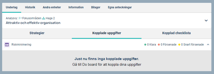 I fliken "Kopplade uppgifter" kan du se vilka Do boards som är kopplade och hur status är på uppgifter som är kopplade till objektet. Du kan gå direkt till Do boarden genom att klicka på den.