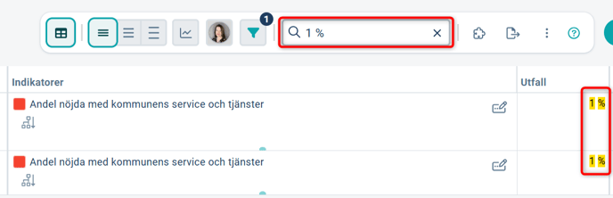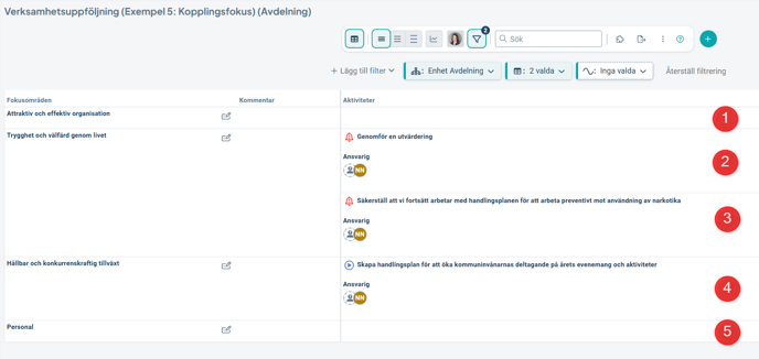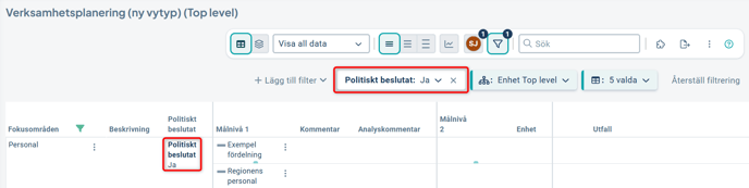 Genom att ställa in ett standardfilter med ett nyckelord kan du skapa specifika vyer för särskilda ändamål, exempelvis endast visa fokusområden med tillhörande mått och aktiviteter som är politiskt beslutade.