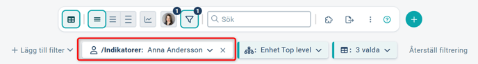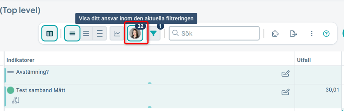 I nya vytypen finns ett filter för det du själv ansvarar för i vyn som alltid är tillgängligt. Du hittar det till vänster om filtertratten. Siffran visar hur många objekt du ansvarar för med aktuell filtrering. Klicka på knappen med din bild (eller dina initialer) så filtreras dina objekt fram och markeras i en avvikande färg.