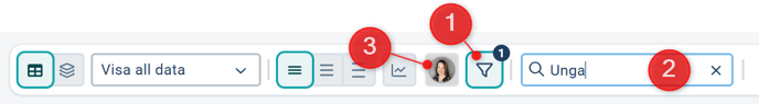 För nya vytypen klickar du på filtertratten (1) för att filtrera på period, kolumn, nyckelord eller andra egenskaper. Dessa val stannar sedan kvar i vyn för dig tills du tar bort filtret.