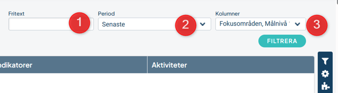 För klassiska vyer kan du välja att visa Fritextfilter (1), Periodfilter (2) och Kolumnfiltrering (3) direkt i vyn via inställningar i filterinställningarna.