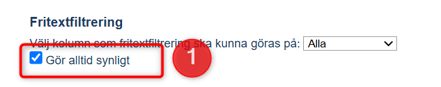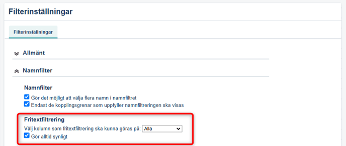 I de klassiska vytyperna kan du aktivera fritextfiltret i filterinställningarna under avdelningen namnfilter. Du kan också välja att fritextfiltret alltid skall vara synligt i vyn.