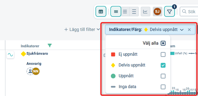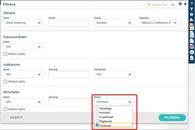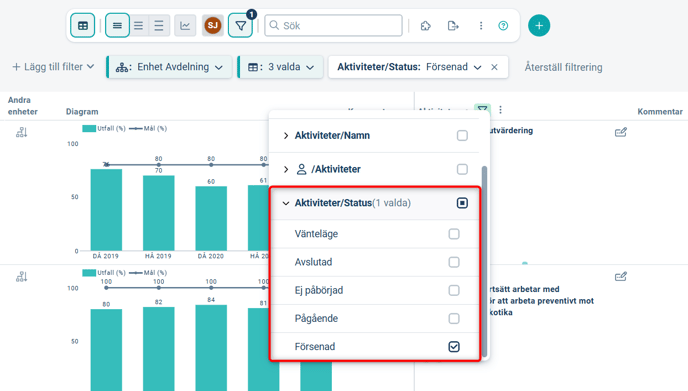 Klicka på kolumnens filtertratt för att välja önskad status. Du kan välja ett eller flera alternativ.