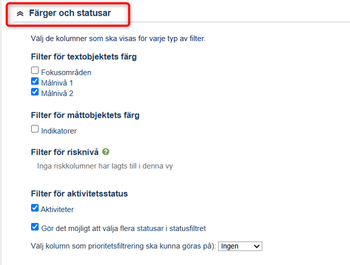 För att kunna filtrera på färg och status aktiverar du inställningarna under avsnittet "Färg och status" i filterinställningarna. Här ställer du även in filter för riskkfärg/risknivå.