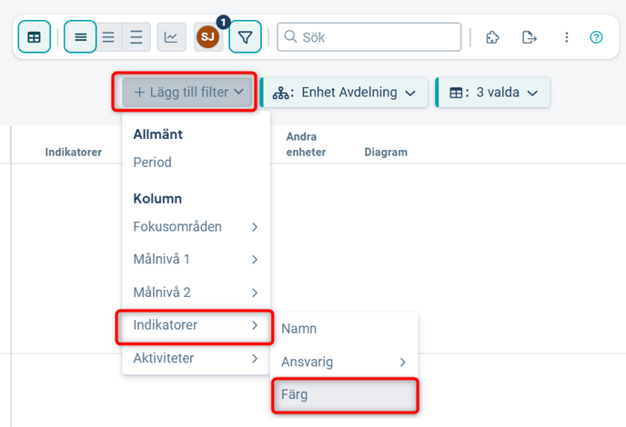 I klassiska vytyper använder du färgfilter och färgstatistik. Filtret visas i vyn under titeln på vyn och innebär dels att du kan klicka på respektive status/färg för att i vyn filtrera fram noder med vald status/färg. Dels kan du så klart även ser hur många noder av varje status/färg som finns i vyn.