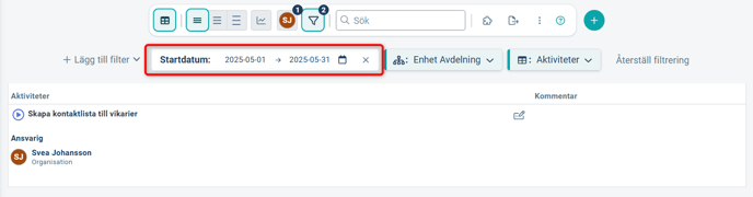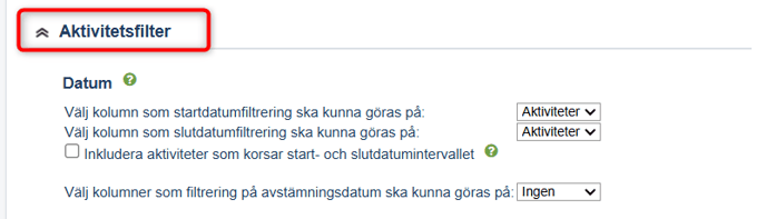 Aktivera datumfilter i filterinställningarnas avsnitt Aktivitetsfilter. Du anger vilken kolumn som sökningen skall gå att göra på, eller alla kolumner, samt Start- och/eller Slutdatum.