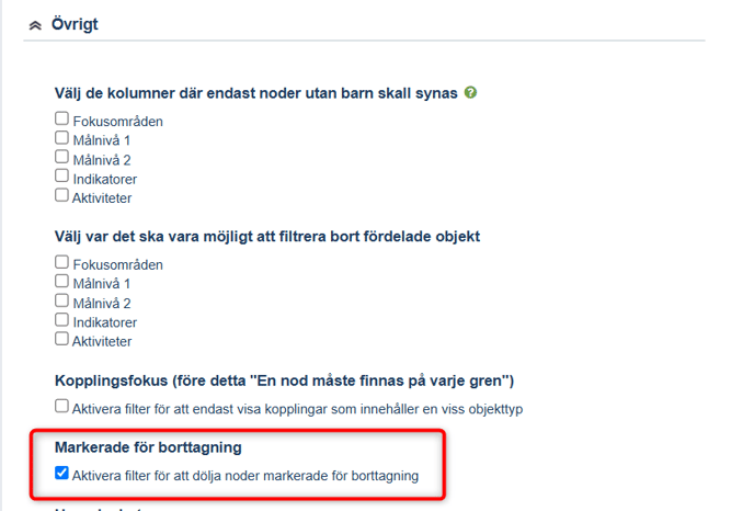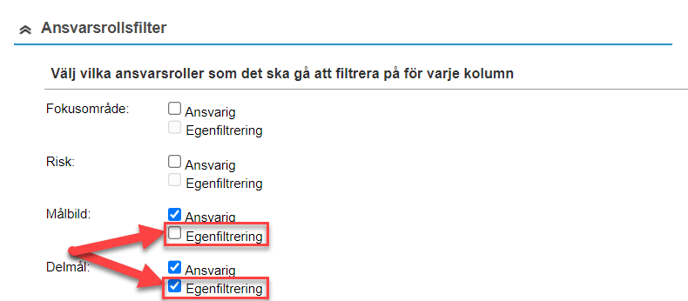 Du kan även välja att aktivera möjligheten till egenfiltrering, alltså de noder du själv är ansvarig i någon ansvarsroll.