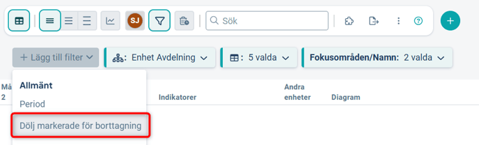 I planeringsversionen kan du markera objekt för borttagning. Dessa tas då bort vid versionshanteringen. När du har markerat ett objekt för borttagning blir denna rödmarkerad i vyn. Då den tar fokus kan det vara bra att filtrera bort dessa. vilket du kan göra genom att aktivera denna filterfunktion.